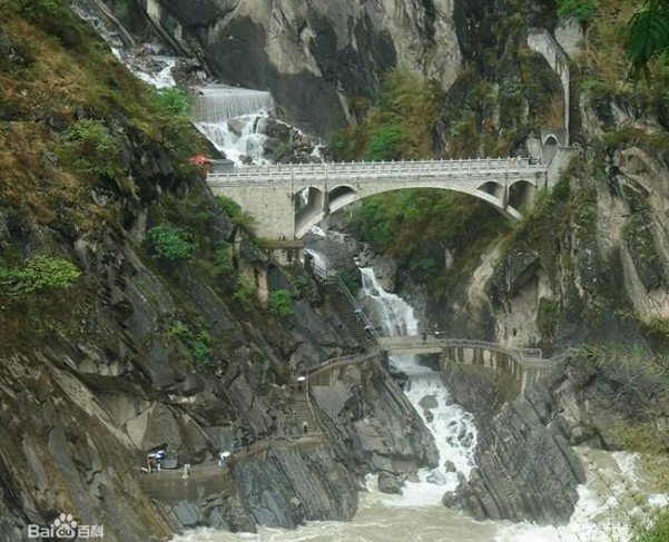 虎跳峽,中國(guó)最深的峽谷之一。在云南省玉龍納西族自治縣(原麗江納西族自治縣)龍?bào)脆l(xiāng)東北。峽谷長(zhǎng)16公里,南岸玉龍雪山主峰海拔5,596米,北岸中甸雪山海拔5,396米,中間江流寬僅30~60公尺。虎跳峽的上峽口海拔1,800公尺,下峽口海拔1,630公尺,兩岸山嶺和江面相差2,500~3,000公尺,谷坡陡峭,蔚為壯觀。江流在峽內(nèi)連續(xù)下跌7個(gè)陡坎,落差170公尺,水勢(shì)洶涌,聲聞數(shù)里,為世界上最深的大峽谷之一。舊時(shí)曾因山崩截?cái)嘟鳎两裆杏斜婪e物遺留。另有廣東信宜虎跳峽與之同名。