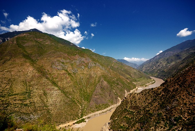 金沙江由北東去,匯集雅壟江、大渡河、嘉陵江,于是中國便有了長江。瀾滄江由北南下緩緩而流,穿越國界便成了鄰國湄公河的上游。怒江山北南下奔騰急湍闖進緬甸便成了薩爾溫江的上游。三江同發(fā)源于青藏高原,三江攜手并肩在云南崇山峻嶺中奔流。而金沙江經(jīng)石鼓鎮(zhèn)天造奇觀(長江第一灣)急轉(zhuǎn)回頭大江東去最終流入太平洋……而瀾滄江、怒江穿流緬甸、越南、老撾、泰國最終流入印度洋……
