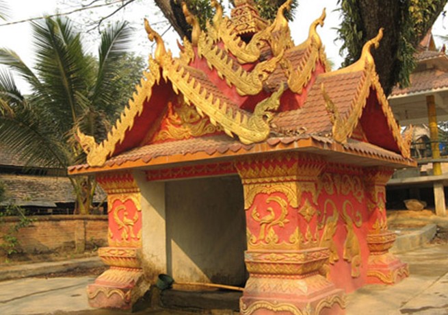傣族水井的建筑頗具匠心,井身造型和裝飾,都采用傣族崇敬的大象、孔雀、塔等作造型。井身鑲了許多小圓鏡,莊重華貴,這是因?yàn)榇鲎逑菜⒕此⒂盟硎緪?ài)情、表達(dá)祝福,凡是傣族村寨都有各種形狀的水井塔,曼金堡水井塔,就是典型的寶塔形水井。