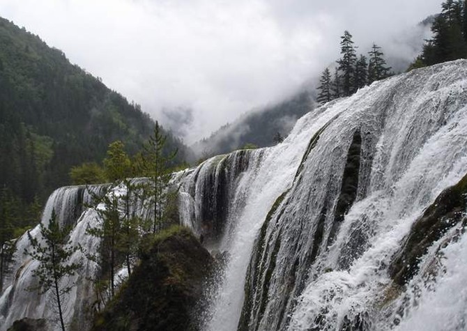 珍珠灘瀑布四周長滿松、杉等樹木,從公路上下去,須穿越過一道密密的綠色走廊,方可來到瀑布旁邊。珍珠灘瀑布,從某種意義上講,類似于黃果樹瀑布群中的螺螄灘瀑布。它不完全是一個翻崖落水的跌水,而是上有一個約20幾度傾角的灘面,瀑布先在灘面上緩緩流淌,由于灘面由鈣華組成,鈣華表面又有鱗片般的微小起伏,當薄薄的水層從灘面上淌過,在陽光的照射下,若萬顆明珠,閃著銀光,故得名珍珠灘。珍珠灘上由于水流較緩,灘面較平坦,故游人可脫靴赤足在灘上行走。但由于瀑水由雪山上融雪之水匯流而成,故水溫較低,即使盛夏時節(jié),漫步在珍珠灘上,亦覺得寒氣逼人,令人發(fā)抖的。