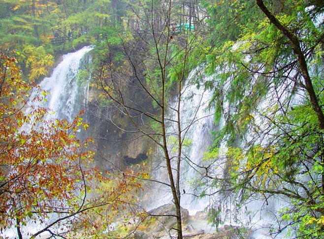 縱攬我國瀑布,或從斷崖驀然跌下,勢若大海倒瀉,銀河決口,聲勢恢宏;或從峭壁凌空飛落,狀如白綾脫軸、裊裊娜娜,姿態(tài)千般;或從洞上翻崖直下,形若水晶珠簾,垂掛洞前,妙趣橫生。而九寨溝瀑布群,則從長滿樹木的懸崖或灘上悄悄流出,瀑布往往被分成無數(shù)股細小的水流,或輕盈緩慢,或急流直瀉,千姿百態(tài),妙不可言,加上四周群山疊翠,滿目青蔥,至金秋時節(jié),層林盡染,瀑布之景就更為神奇秀麗了。