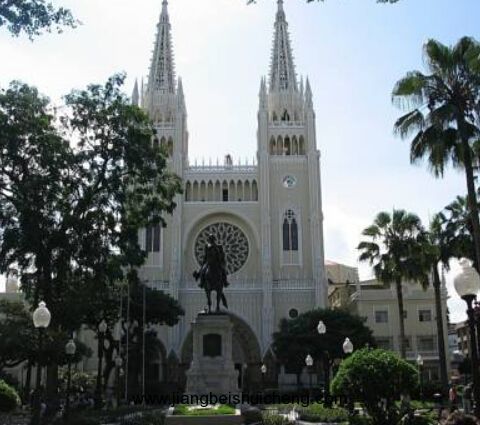 瓜亞基爾城中心是一百年廣場(chǎng),廣場(chǎng)上高聳著1920年修建的巨大的解放紀(jì)念碑。著名的弗朗西斯科大教堂在廣場(chǎng)不遠(yuǎn)的地方,這座建筑氣勢(shì)宏偉,裝飾華麗,是瓜亞基爾的建筑珍品。教堂前面有一座風(fēng)景優(yōu)美的公園,在公園樹林深處可觀賞到各種珍貴動(dòng)物。瓜亞基爾最繁榮的街道是10月9日大道,路旁商店比鱗而立,人群擁擠。大道穿過一百年廣場(chǎng),通向馬萊孔濱水區(qū),濱水區(qū)沿瓜亞斯河岸鋪開。壯觀典雅的市政廳和政府官就坐落在這一帶。漫步街頭,可看到南美獨(dú)立運(yùn)動(dòng)的領(lǐng)袖玻利瓦爾和圣馬丁的塑像。1822年7月26日—27日,這兩位民族英雄就在此共商大計(jì),決心把西班牙殖民者全部趕出拉美大陸并爭(zhēng)取南美各國(guó)的徹底獨(dú)立。這次歷史性的會(huì)晤為南美人民贏得了偉大的勝利。