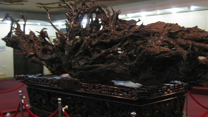 《中華根展覽》是由千年古樟巨根雕制而成。它長(zhǎng)6.30米,高2.30米,其狀屈曲崢嶸,其勢(shì)鳳翥龍?bào)矗菫?ldquo;養(yǎng)在深閨人未知”之珍寶。它鐫刻著女媧補(bǔ)天、夸父追日、大禹治水、赤壁賦等遠(yuǎn)古傳說,歷代史事,英烈忠魂,前修偉業(yè),煌煌五千年文明史,盡覽于一根。洋洋灑灑百余構(gòu)圖,故事經(jīng)典,場(chǎng)面恢宏,造型傳神,栩栩如生,嘆為觀止。四周星羅姿態(tài)各異精品根藝80余類,根造型、根拼字、根貼畫、根包石、竹蔸雕……品類繁多,琳瑯滿目。每件根藝標(biāo)示牌均配以詩文,新穎別致,內(nèi)涵博深,耐人品味。觀者感慨:通觀此展,仿若閱讀一部歷史巨著,又似步入大千文學(xué)殿堂,更象闖進(jìn)精美絕倫的藝術(shù)大觀園,不知不覺中,深受傳統(tǒng)美德和民族精神的熏陶。