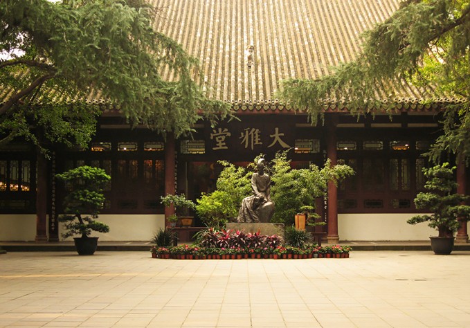 今日草堂,古樸典雅,規(guī)模宏偉,占地300多畝。其中大廨、詩(shī)史堂、工部祠3座主要紀(jì)念性建筑物,坐落在中軸線上,幽深寧?kù)o。廨堂之間,回廊環(huán)繞,別有情趣。祠前東穿花徑,西憑水檻,祠后點(diǎn)綴亭、臺(tái)、池、榭,又是一番風(fēng)光。園內(nèi)有蔽日遮天的香楠林、傲霜迎春的梅苑、清香四溢的蘭園、茂密如云的翠竹蒼松。整座祠宇即有詩(shī)情,又富畫(huà)意,是人文景觀和自然景觀相結(jié)合的著名園林。