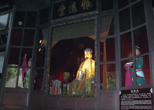 劉備殿后,下數(shù)節(jié)臺(tái)階(武侯祠低于漢昭烈廟,象征古代君臣關(guān)系),是一座過廳,掛有“武侯祠”匾額。武侯祠是紀(jì)念三國時(shí)蜀漢丞相武鄉(xiāng)侯諸葛亮的祠堂,諸葛亮生前封“武鄉(xiāng)侯”,死后謚號“忠武”,故紀(jì)念他的祠堂稱作“武侯祠”。諸葛亮殿懸“名垂宇宙”匾額,兩側(cè)為清人趙藩撰書“攻心”聯(lián):“能攻心則反側(cè)自消,自古知兵非好戰(zhàn);不審勢即寬嚴(yán)皆誤,后來治蜀要深思。”的聯(lián)文,是頗負(fù)盛名的一副對聯(lián),借對諸葛亮、蜀漢政權(quán)及劉璋政權(quán)的成敗得失的分析總結(jié),提醒后人在治蜀、治國時(shí)借鑒前人的經(jīng)驗(yàn)教訓(xùn),要特別注意“攻心”和“審勢”。正殿中供奉著諸葛亮祖孫三代的塑像。殿內(nèi)正中有諸葛亮頭戴綸巾、手執(zhí)羽扇的貼金塑像,像前的三面銅鼓相傳是諸葛亮帶兵南征時(shí)制作,人稱“諸葛鼓”。鼓上有精致的圖案花紋,為珍貴的歷史文物。大殿頂梁由烏木制成,上書諸葛亮寫給兒子諸葛瞻《誡子書》中“非澹泊無以明志,非寧靜無以致遠(yuǎn)”(不看輕世俗的名利就不能明確自己的志向,不是身心寧靜就不能實(shí)現(xiàn)遠(yuǎn)大的理想)。諸葛瞻及其子尚在綿竹抗擊魏將鄧艾的戰(zhàn)斗中不幸身亡。