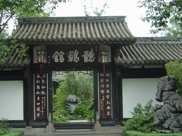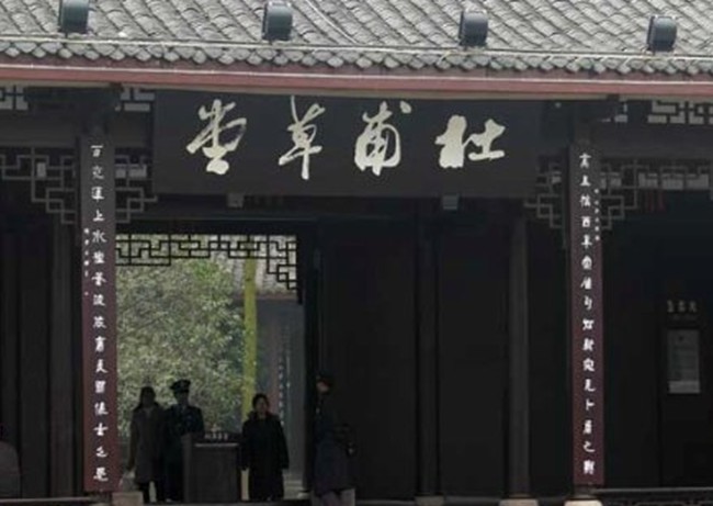 如今的草堂是在明代所建工部草堂遺址上,于八十年代重建的仿古園林建筑群。草堂內(nèi)詩圣生平館,中院宏偉的詩史堂,花木扶疏的后院。暖融融的春陽下,幾樹海棠開得正艷,火焰般的花朵給清靜的小院平添了幾分亮色。碧綠的荷池中佇立著一尊杜甫的全身塑像,詩人撫袖昂首,滿含憂患的雙眼遙望著遠方。這情景使你想起那令人不堪回首的一幕:公元770年冬的一天,杜甫在離開四川后,終因病痛纏身,窮困潦倒而客死于湘江上的一艘小船上。"青春作伴好還鄉(xiāng)"對于詩人來說,只是一個無法實現(xiàn)的夢……