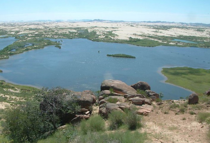 玉龍沙湖位于內(nèi)蒙古赤峰市翁牛特旗烏丹鎮(zhèn)境內(nèi),國家AAA級景區(qū),距赤峰市90公里。旗政府所在地烏丹鎮(zhèn)區(qū)與該景區(qū)有三級油路相通。玉龍沙湖度假區(qū)集沙漠、沙地、古松、怪石、奇峰、濕地、草原、湖泊為于一身,5萬畝草原與茫茫無邊的科爾沁沙地相連,沙地中有一眼清泉,泉水噴涌近1米高,每小時噴水?dāng)?shù)百噸,在沙漠中積水成湖。