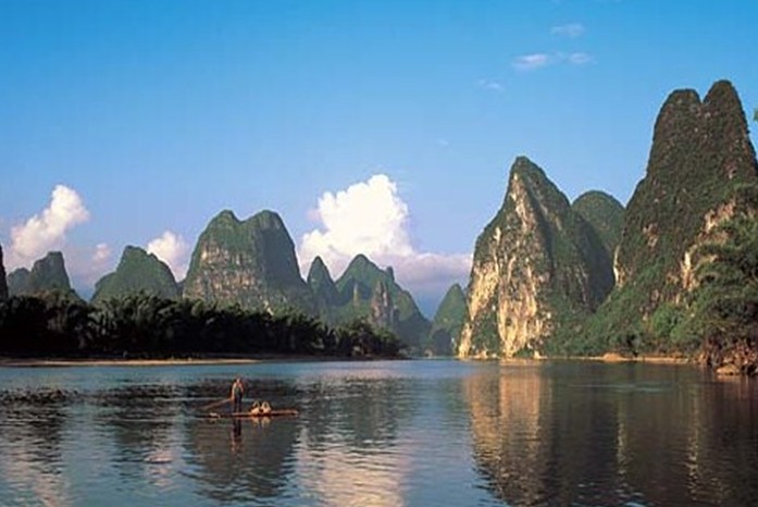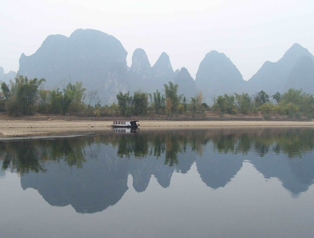 黃布倒影是漓江精華中的精華,位于漓江83公里精華段興坪古鎮(zhèn)境內(nèi),游船經(jīng)過(guò)楊堤,過(guò)了九馬畫山,江面逐漸開闊,水平如鏡,青峰倒影,美不勝收。離畫山之南不遠(yuǎn),便是黃布灘。漓江山色之美,美在倒影中;漓江倒影之美,就數(shù)黃布灘倒影最為醉人。這里江流清澈,碧綠透底,從水面上可以看到江底有塊米黃色的大石板,長(zhǎng)、寬各數(shù)丈,恰似一匹黃布平鋪在河床之上,黃布灘由此得名。