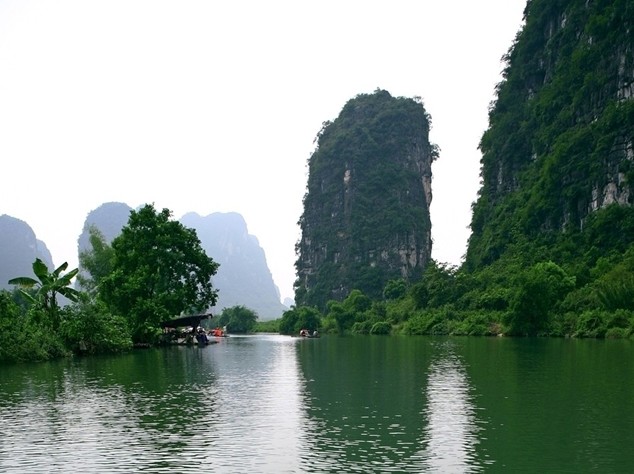 遇龍河兩岸青山連綿,造型各異,百態(tài)千姿;一路翠竹夾道,綠樹成行,芳草萋萋;而若遇晴日,則藍(lán)天白云,碧水綠草,開朗而明快;若逢雨天,更是霧繞云遮,百媚千嬌。假若把漓江比作風(fēng)情萬種的大家閨秀的話,那么,遇龍河就更應(yīng)該是小家碧玉了。