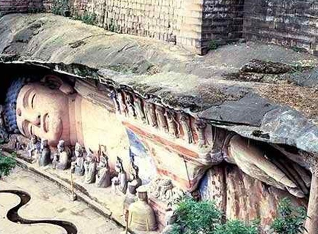 寶頂山造像以大佛灣為中心。大佛灣狀若馬蹄形.版權(quán)所有山東聊城聊之旅國際旅行社有限公司,轉(zhuǎn)載必究!全長500米。全部造像精心規(guī)劃,宛如一幅巨型畫卷。號稱“世界第四大臥佛”《釋迦涅磐圖》就在這里。這尊臥佛作半身處理,雙腳似乎伸進(jìn)南巖中,使臥佛雖形半身,卻有全身之妙。這種意到筆不到的表現(xiàn)效果,正富于傳統(tǒng)藝術(shù)的含蓄美。有趣的是,臥佛頂?shù)乃刂校€刻有一雙兩公尺的足印,傳說這“是佛去西天留下的最后足印,亦是大足縣名之由來。