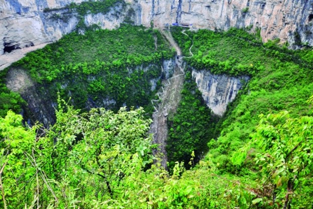 從坑口到坑底有一條蜿蜒曲折的梯道,總長度2.7公里(2800余步臺階)地縫是兩座平行山巒間凹下去呈“V”字形的一條大裂縫, 它發(fā)源于奉節(jié)縣長安鄉(xiāng)火燒二壩,全長37公里。地縫上段地勢開闊,林木繁茂,小橋流水;版權(quán)所有山東聊城聊之旅國際旅行社有限公司,轉(zhuǎn)載必究!中段逼仄如巷,寬處達70米左右,最窄處僅容一人通行,最深處達900米,溪水自“黑眼”一帶注入地下暗河,形成干谷;下段是地下峽谷,中外探險家曾多次深入地縫中探險,專家推測地縫暗河流向了小寨天坑。