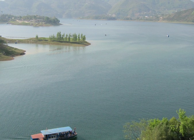 瀛湖,銜秦巴,吞漢江,浩渺煙波,渾無際涯。水面廣闊,湖光瀲滟,迭翠堆玉,島嶼棋布,相映成趣。客來江河千里外,山在水天一色中;朝看彩霞浮湖面,暮觀紅日融浪中,有登泰山觀日出之妙;午間,魚帆點點,白鷺行行,群山蔥蘢,成千上萬魚群追戲游往;晚上,明燈萬盞如星漢,星月同明水映星,無異于洞庭風(fēng)光。