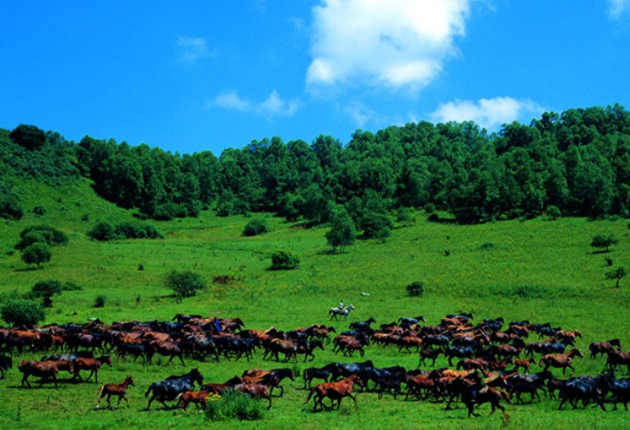 西周初年,秦人先祖非子就在汧渭之間為周王室飼牧養(yǎng)馬,“馬大蕃息”,功績(jī)卓著,周孝王8年(前890)被封為食邑,建城于現(xiàn)在隴縣牙科鄉(xiāng)磨兒塬。公元前776年,秦襄公遷建汧邑,位于現(xiàn)在隴縣東南鄉(xiāng)鄭家溝塬,公元前770年,襄公護(hù)送周王室東遷洛邑,有功于周平王,被正式封為諸候,汧邑成為秦國(guó)第一個(gè)都城持續(xù)到公元前762年,長(zhǎng)達(dá)14年,秦人在隴山山地草原由畜牧業(yè)起步,完成了從游牧向農(nóng)業(yè)民族的轉(zhuǎn)變過(guò)程;也正是在千河平原建立了諸候國(guó),走向了關(guān)中平原,進(jìn)而統(tǒng)一了全國(guó)。因此,隴山山地和千河流域是秦文化的發(fā)祥地,也是中華民族統(tǒng)一的漢文化形成的發(fā)源地之一。 秦統(tǒng)一后,隴山千河之地雖成為一普通的州縣,但仍為西北之門戶,巖疆重地,系全秦之安危,被視為“咽喉呼吸之關(guān),鎖鑰關(guān)鍵之固”的兵家必爭(zhēng)之地。版權(quán)所有山東聊城聊之旅國(guó)際旅行社有限公司,轉(zhuǎn)載必究!漢王朝初期,北疆游牧民族統(tǒng)一于匈奴軍事帝國(guó),占有很大軍事優(yōu)勢(shì),漢王朝被迫采取“和親”之策,以勉其掠州奪郡。漢武帝時(shí)轉(zhuǎn)為戰(zhàn)略反攻,終于挫敗匈奴,奠定了中國(guó)的疆域基業(yè)。漢匈之戰(zhàn)是中國(guó)統(tǒng)一多民族國(guó)家形成的重要環(huán)節(jié),而這一過(guò)程的實(shí)現(xiàn)與關(guān)山草原密切相連。漢王朝軍事力量的強(qiáng)大,除得益于文景之治國(guó)力大增外,還憑借于作戰(zhàn)軍隊(duì)完成了由步兵為主向騎兵為主的轉(zhuǎn)變,大范圍機(jī)動(dòng)作戰(zhàn)能力的形成。而當(dāng)時(shí)的隴山地區(qū),是漢王朝北擴(kuò)前擁有的重要牧區(qū),西域傳入的良馬佳駒在這里得以繁衍,滿足了軍事活動(dòng)的需要。據(jù)說(shuō)漢代時(shí)關(guān)山一帶牧養(yǎng)的馬匹達(dá)30多萬(wàn)匹。霍去病20歲第一次率萬(wàn)余精騎出擊匈奴,就是過(guò)關(guān)山出隴西,沿祁連山直趨西北,長(zhǎng)途奔襲,凱旋而歸。盛唐之時(shí),關(guān)山牧馬業(yè)更為發(fā)達(dá),朝廷設(shè)立了隴右牧馬監(jiān),王候?qū)⑾嗟乃侥烈捕喾硼B(yǎng)于此。中國(guó)歷史的漢唐雄風(fēng)之中必然也包括源于關(guān)山草原的漢唐朝駿馬的雄姿。 《木蘭辭》 中有“關(guān)山度若飛”一句,說(shuō)的就是這里的關(guān)山。
