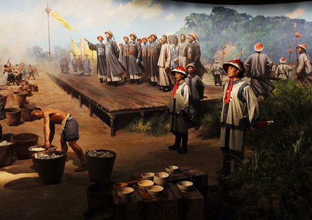 該館的陳列形式突破了傳統(tǒng)的陳列手法,注意把文物放在一定的環(huán)境氣氛中去展出,采取畫物結(jié)合,實(shí)物與輔助展品結(jié)合,采用場(chǎng)景、沙盤、聲光電模型、尋像放映等多種手段,使陳列形式生動(dòng)、形象。如該館為了反映當(dāng)年林則徐、關(guān)天培用木排鐵鏈封鎖虎門海口的情形,把征集來(lái)的木錨及一艘早期的劃船送上展廳,并復(fù)制了大木排鐵鏈,與長(zhǎng)33米,高2.8 米的虎門海口形勢(shì)背景畫相結(jié)合,版權(quán)所有山東聊城聊之旅國(guó)際旅行社有限公司,轉(zhuǎn)載必究!構(gòu)成了一幅氣勢(shì)磅礴,頗為壯觀的場(chǎng)景,形象地再現(xiàn)了當(dāng)年用木排鐵鏈封鎖虎門海口的形勢(shì),大大增強(qiáng)了展覽的效果。