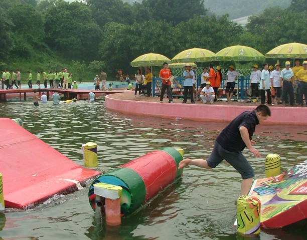 參訓(xùn)隊員必須從岸邊的起點,利用空中的長繩蕩到水面的兩個1平米的平臺上,一個平臺站滿人后再轉(zhuǎn)移到另一平臺上,每個平臺目前最多可站26人。訓(xùn)練各級人員相互理解、互相包容,相互支持與緊密合作,打破隊員之間、男女之間、部門之間的隔閡,勇創(chuàng)佳績的決心和勇氣。