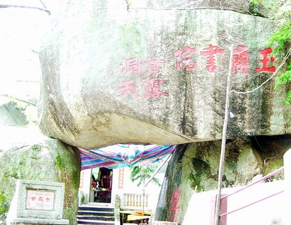 寺置身于天然石室之中,一塊700平方米的巨石凌空飛出,其平如削,其固如磐,蔚為奇觀。寺門(mén)由3塊巨石疊成品字型,門(mén)上“玉簡(jiǎn)書(shū)院”陳?ài)E尚存,“甘露洞天”勒石猶在。寺中有“天笠源流”、“萬(wàn)壽云宮”等摩崖石刻多處。