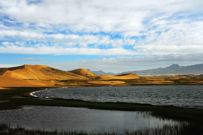 這就是金子海,蒙古語意為阿東木拉古湖,面積約0.45平方公里。相傳成吉思汗領兵經(jīng)過此地時,丟下的金盞化為金子海;版權所有山東聊城聊之旅國際旅行社有限公司,轉載必究!也有傳說牦牛山上下來一對金羊,在湖邊飲水,嘗到水味香醇甘甜,就不愿再回山而進入湖中,故稱該湖為金子海。海的西側、西北側、東側都被沙山環(huán)抱,沙質是那般細膩,情不自禁讓人赤足,與其有更為親密的接觸。唯獨海的東南側是高高的蘆葦和近百米的草帶,吸引著鳥禽、牛羊覓食、嬉戲、休憩。水至清則無魚。由于金子海是由一眼甘甜的泉水日積月累而成,因此水極為清澈,淺水處不曾發(fā)現(xiàn)魚兒,版權所有山東聊城聊之旅國際旅行社有限公司,轉載必究!有的只是小海螺和小貝殼。其實,海的深處是有魚的。考古發(fā)現(xiàn)金子海的東邊是青銅器時代的文化堆積層,有石器和諾木洪文化夾砂褐陶罐殘片;說明,海的形成歷史悠久。在茫茫戈壁,有這樣一池甘甜的泉水養(yǎng)育著周圍的牧民,滋潤著這片土地上的一切生物,生生不息。