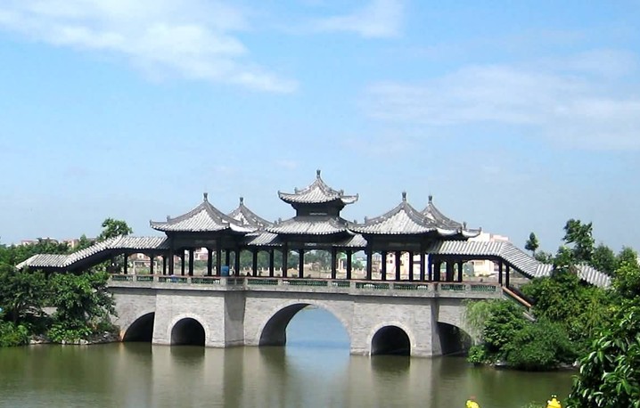 粵暉園歸水橋位于無香湖與映月湖交接的堤岸上,下設(shè)水閘,勢納東江,隨東江潮汐而變,換凈園水,永葆園內(nèi)水質(zhì)長清,故稱歸水橋。有詩為證:“橋自東江歸碧水,園從正道入青蚨”。歸水橋獨具嶺南特色,形象豐富。橋上架五亭如梅花布置,橋身用青石砌成,下由十二個大小不同的橋墩組成十五孔,平面呈“工”字形,兩側(cè)加階梯,橋面上矗立琉璃攢尖方亭五座,正中的主亭為重檐,其四角為單檐。每逢月滿,從正側(cè)橋孔觀望,每洞各映一月,金色晃動,眾月襯橋,使湖景更為美麗。歸水橋也是接通繞翠廊的關(guān)口,橋面相對前園高出3米多,這樣即使無香湖四周景觀高低起伏,又使繞翠廊有層次感,高低疊立,倚橋亭遠眺,視野開闊,園內(nèi)美景盡收眼底。正是“水應(yīng)園生,園因水活”。