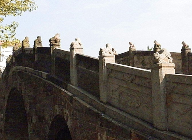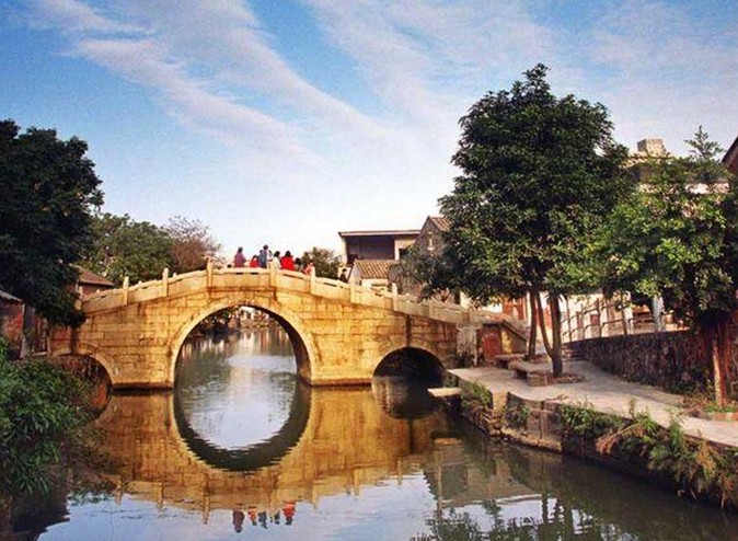 該橋兩邊斜道不砌石級(jí),版權(quán)所有山東聊城聊之旅國(guó)際旅行社有限公司,轉(zhuǎn)載必究!行人來往象上下斜坡一樣,古代車馬過橋,可暢通無阻。站在橋上左右眺望,寬闊的河涌?jī)砂叮R的石砌墻緊靠河壁。蕉林蔗地上,舊日店鋪基礎(chǔ)依稀可辨,為我們勾勒出一幅繁榮的古代水鄉(xiāng)市集景象。