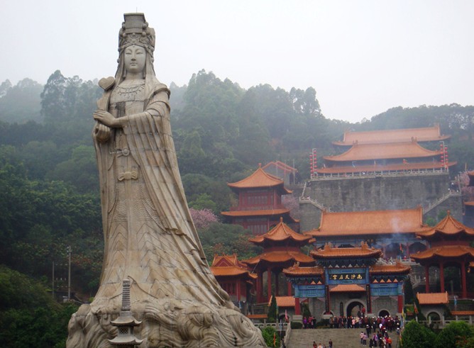 南沙天后宮,緊臨珠江出海口伶仃洋,坐落于大角山東南麓,依山傍水,其建筑依山勢層疊而上,殿宇輝煌,樓閣雄偉,在天后廣場正中就是石雕天后圣像,是為紀(jì)念海上女神林默而建,建筑特點(diǎn)是集北京故宮的風(fēng)格和南京中山陵的氣勢于一體,其規(guī)模是現(xiàn)今世界同類建筑之最,被譽(yù)為“天下天后第一宮”,也是東南亞最大的媽祖廟。天后圣像高達(dá)14.5 米,屹立在天后宮廣場正中。