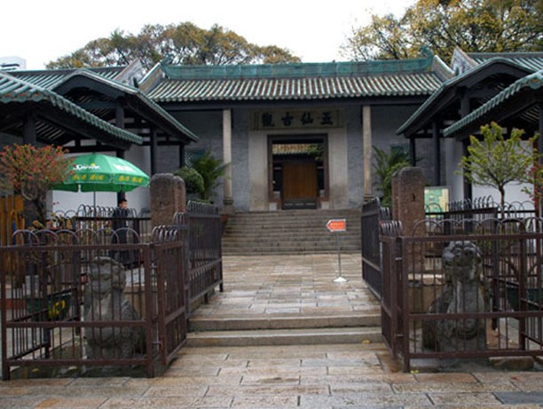 五仙觀(guān)位于惠福西路。現(xiàn)寺觀(guān)建于明洪武七年(1337年),是一座祭祖五仙的谷神廟。該觀(guān)屬道教寺廟,寺坐向南,門(mén)上大匾上有清人書(shū)寫(xiě)的“五仙大觀(guān)”四個(gè)大字。五仙觀(guān)依山而建,現(xiàn)存有頭門(mén)、后殿、東齋與西齋。五仙觀(guān)為綠琉璃瓦重檐歇山頂,木構(gòu)架保存完好,玲瓏新巧。后殿東側(cè)裸露的一塊紅砂巖,上有巨大的腳印凹穴,古人一向認(rèn)為這是“仙人拇跡”,重點(diǎn)保護(hù)下來(lái)。明清兩代,這里分別以“穗石洞天”和“五仙霞洞”列入羊城八景。