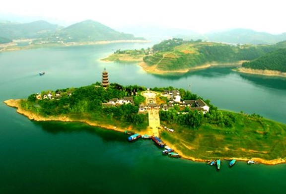 從空中俯看象一只美麗的孔雀開屏,四周又在青山綠水碧波之間,因此取名翠屏島。從安康乘車經瀛湖鎮(zhèn)入進島路全長30公里,距金螺島僅一公里。