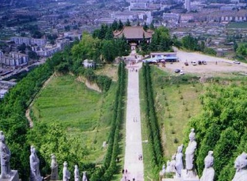 穿過(guò)祭祀?yún)^(qū),便進(jìn)入墓冢區(qū)。沿著長(zhǎng)長(zhǎng)的陵道拾級(jí)而上,兩邊塑立著百代帝王石像,總共16位,依歷史順序依次排列為:堯、舜、禹、啟、夏桀、成湯、盤(pán)庚、紂王、周文王、周武王、周幽王、周平王、鄭莊公、齊桓公、秦穆公、宋襄公等。