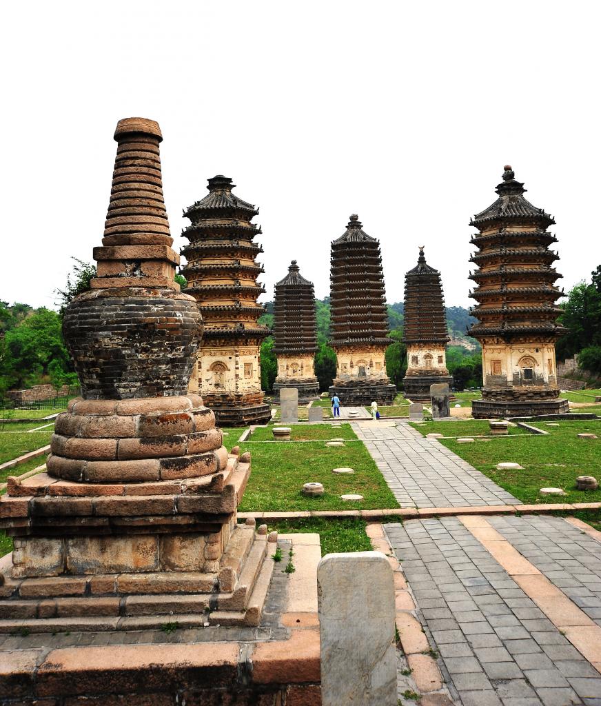 經(jīng)修繕,現(xiàn)景區(qū)內(nèi)可供參觀的古塔有18座。塔的形制、風(fēng)格各異。其中,密檐式磚塔共計(jì)有7座。其整體形象分別由“須彌座”式的塔基,雕刻有門窗、佛像的塔身,層層密檐和塔剎等部分組成。外輪廓線條挺拔秀麗,磚雕精美細(xì)膩,是研究古代建筑美學(xué)及佛教文化的絕好資料。
