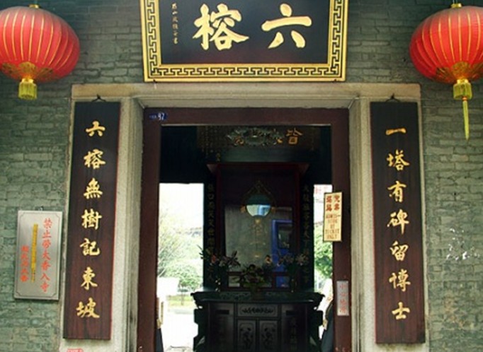 ◎公元1100年(北宋元符三年),大文豪蘇東坡由海南貶所北歸,路經(jīng)廣州到該寺游玩時(shí),應(yīng)寺僧道琮之請(qǐng)為寺題字,他見(jiàn)寺內(nèi)六株榕樹(shù)綠蔭如蓋,盤根錯(cuò)節(jié),氣勢(shì)不凡,即欣然書(shū)下“六榕”二字。