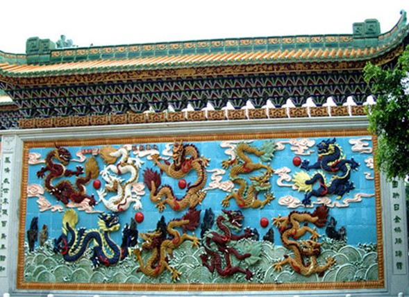 進入南粵苑大門,迎面是一幅大型的照壁——九龍壁,這是“龍翔鳳翥”美景。九龍壁下有雕花青石底座,上有“玉包金”琉璃瓦蓋頂,四周是白玉石欄河。九龍壁有著王者氣派,顯示中華民族龍的文化源遠流長。為了突出龍的形象,制作者采用浮雕技術塑造燒制,很有立體感。在海水、祥云的映襯下,九條分別為黃色、紅色、紫色、白色、藍色的巨龍,喜戲龍珠,形態(tài)生動,翻騰自如,有如遨游滄海,又似騰飛九霄。特別是在陽光照射下,熠熠生輝,色彩斑斕,華美亮麗。