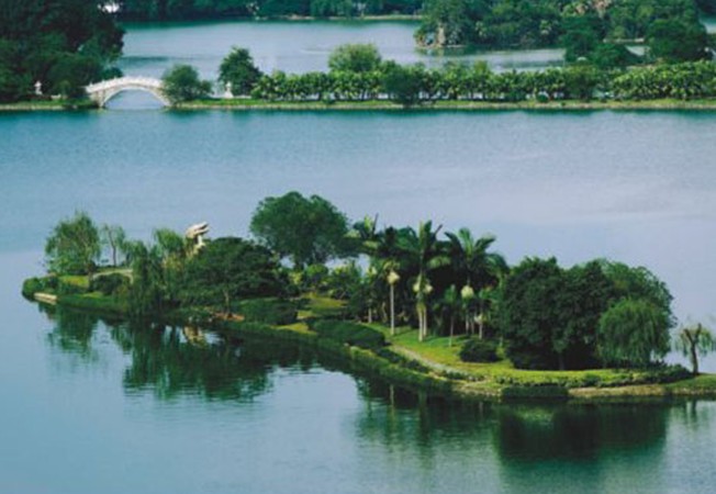 關(guān)于湖東東門(mén)塘的化容橋,有一個(gè)美麗的傳說(shuō)。相傳有一位其貌不揚(yáng)的姑娘,在桂山采桂花為生,一天她進(jìn)城賣(mài)桂花藥,正好碰上皇帝派人在湖邊搭臺(tái)選妃,觀看的百姓人山人海,姑娘也擠進(jìn)人群翹首觀望,誰(shuí)知一不小心被擠落水里。奇怪的是當(dāng)她被救起來(lái)后,變得如出水芙蓉,艷驚眾人,于是當(dāng)場(chǎng)被選入皇宮。此后,湖上的這座橋就被叫作化容橋(也稱(chēng)化龍橋)。當(dāng)然這只是傳說(shuō),但也反映了河源的水水質(zhì)之好,河源人的愛(ài)美之心自古有之。化龍橋南是曲折有致的飛鸞橋,橋上花草如茵。此橋的特別之處在于并不貫通兩岸,游人走到橋尾,正好身處湖心,坐在亭中,享受著柔和的微風(fēng),看湖水泛起陣陣漣漪,湖岸上的熱鬧就在眼中,卻并不鬧耳,很容易生出一種超然物外的感覺(jué)。化容橋西側(cè)原有兩棵古榕,現(xiàn)在只剩下一棵。另一棵本有兩枝,版權(quán)所有山東聊城聊之旅國(guó)際旅行社有限公司,轉(zhuǎn)載必究!在朱德委員長(zhǎng)逝世前無(wú)緣無(wú)故坍裂了一枝,而另一枝也在毛主席逝世前無(wú)緣無(wú)故連根倒塌了,不知道這是巧合還是天意。