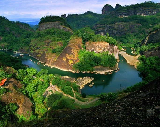 古人游九曲溪,是從武夷宮按曲序逆流而上。武夷宮前,晴川一帶為一曲,從此逆流而上直至齊云峰下的星村鎮(zhèn),為九曲。九曲溪發(fā)源于武夷山自然保護區(qū)桐木關的西北角,全長62.8公里,流域面積(匯水面積)526平方公里,自西向東流至武夷宮匯入崇陽溪。526平方公里的流域面積列入自然保護區(qū)范圍的有125平方公里,列入風景名勝區(qū)范圍的有37平方公里,以及九曲溪生態(tài)保護區(qū)364平方公里。沿途無處不成景。自崇桐公路開通后,游人則是從九曲到一曲順流而下,這樣隨波逐流,更加輕快、迅疾。游九曲,所乘之舟為8~9根去皮毛竹烤后扎成。吃水淺、浮力大,游人乘坐安穩(wěn)舒適,視野開闊,可見山景,能賞水色,漂流而下,疾徐相間,既輕松愜意,版權所有山東聊城聊之旅國際旅行社有限公司,轉載必究!又有驚無險,是現(xiàn)代旅游中頗帶刺激性的旅游項目。當?shù)厝擞职盐湟纳椒Q為"四菜一湯",這起其中的"一湯"代表的就是九曲溪 。