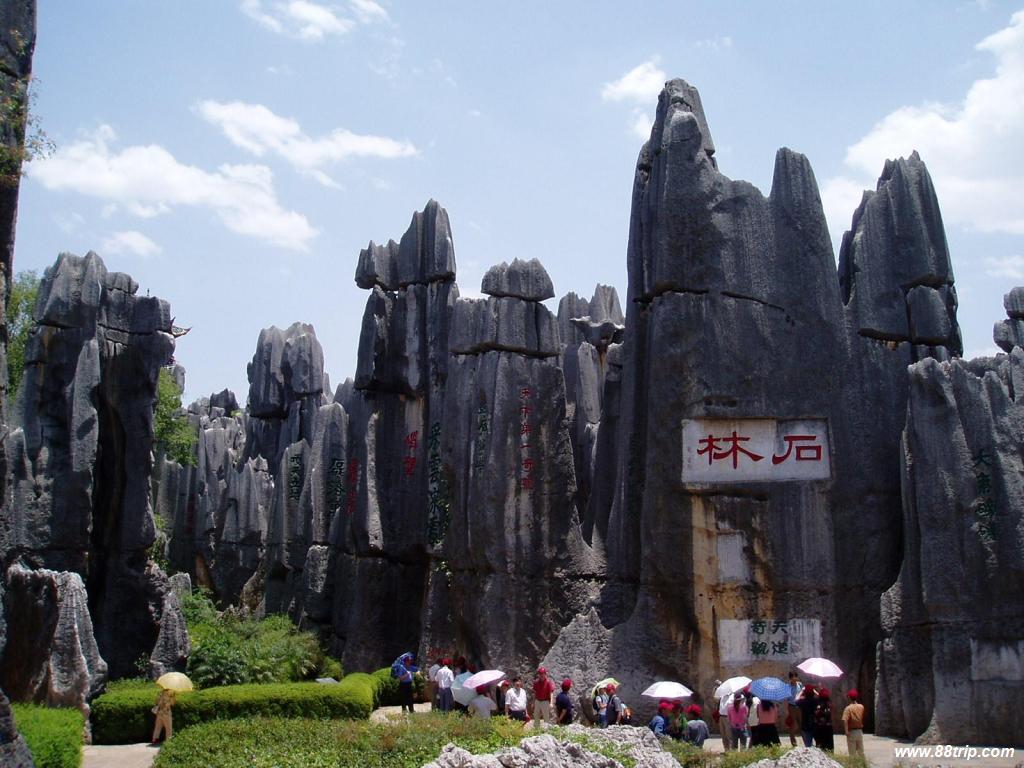 石林位于昆明市東,是世界罕見(jiàn)的風(fēng)景名勝,是大自然鬼斧神工的杰作。在路南廣達(dá)400平方公里的區(qū)域內(nèi),遍布著上百個(gè)黑色大森林一般的巨石群。有的獨(dú)立成景,有的縱橫交錯(cuò),連成一片,占地?cái)?shù)十畝,上百畝不等。最典型的一片叫李子營(yíng)石林,只見(jiàn)奇石拔地而起,參差峰巒,千姿百態(tài),巧奪天工,被人們譽(yù)為“天下第一奇觀”。
