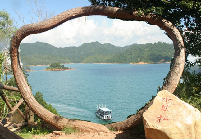 龍鳳島的位置處在萬綠湖心,東部象龍,西部似鳳,整個(gè)島嶼如龍飛鳳舞,故名“龍鳳島”,也是萬綠湖中的愛情島。