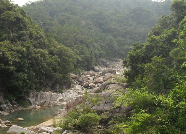 良田河深入8、9公里,那莽莽蒼蒼的原始次生林遮天閉日,深邃的峽谷亂石層層疊疊,又被溪水沖刷得千瘡百孔。這里既有花崗石因垂直節(jié)理發(fā)育而形成的如劍劈斧砍的裂縫,又有花崗石特有的球狀風(fēng)化形成的石蛋,也有流水夾帶礫石沖刷巖體形成的甌穴。