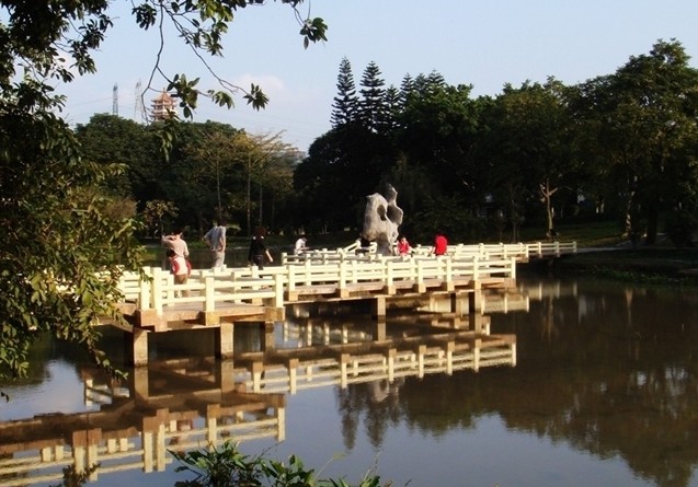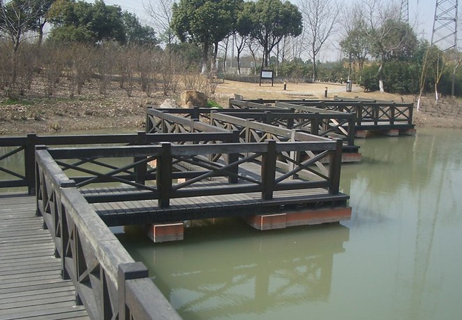 九曲橋九曲十八彎,且每個彎曲的角度大小不一,有大于90度直角的,也有小于90度直角的。九曲橋如今的橋面為花崗石板,每一彎曲處一塊石板上均雕刻一朵季節(jié)性花朵,如正月水仙、二月杏花、三月桃花……直到十二月臘梅;并在九曲橋頭尾的兩塊石板上各雕刻一朵荷花。在湖心亭茶樓門前的一段橋面,中間雕刻一朵荷花,四角則分別雕刻彩云。池中漢白玉的荷花仙女雕塑亭亭玉立,含笑迎候來客。 九曲橋是人文紀念公園三十六景之一,在匯通月潭的上方。九曲橋,顧名思義,是指橋共分成九曲,曲折迂回。“九”是數(shù)字中最大的單數(shù),古有“九九歸一”和“九五之尊”之說,均是對“九”這個充滿吉祥、尊貴的吉數(shù)集中的概括。一、九曲橋是匯通景園三十六景之一。九曲橋,顧名思義,是指橋共分成九曲,曲折迂回。“九”是數(shù)字中最大的單數(shù),古有“九九歸一”和“九五之尊”之說,均是對“九”這個充滿吉祥、尊貴的吉數(shù)集中的概括。橋全長18米,寬2米。全橋由花崗巖和草白玉構成,橋下為放生池,橋的兩旁有廊亭,廊亭的兩旁有石桌石凳,在這里或品茶弈棋,或瀏覽風光,讓你感受到世外的悠閑和寧靜。橋體雕刻精美,構思巧妙,匠心獨運,巧奪天工。穩(wěn)固堅轉,寄雄奇于絕倫之里,寓雋秀于精巧之間,每逢晴天,澄清空明,橋倚碧水,曲橋如玉帶浮水、橋水空蒙、水橋一色、波光瀲滟,水波魚動微風起,一池荷蕊滿園香。池內(nèi)蓮花吐珠、荷葉田田,風月無邊。據(jù)證,九曲橋有兩絕:中秋有“九曲印月”和“曲橋泛鯉”之奇景。池中水草如絲、藤蘿蟠結,魚翔淺底,沙鷗錦鱗,景色蔚為精彩,令人嘆為觀止!著名學者祝陽贊譽:“瑤臺失落鳳頭釵,九曲臥水映碧苔;待看中秋明月夜,九曲橋孔照影來。”