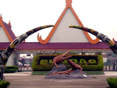 島那金碧輝煌,巍峨壯麗的泰式門樓,門前寬廣的停車場(chǎng)可一次性停放上百輛大巴,進(jìn)入大門后,有一個(gè)十分醒目、高達(dá)4米的大型鱷魚雕像——“鱷魚一家”吸收不少游客紛紛在此攝影留念,離雕像百米處,十多個(gè)鱷魚池座落在鮮花叢中、綠茵地上、池中養(yǎng)有我們祖先稱為“噴火龍”、“鮫龍”的楊子鱷、泰國(guó)灣鱷、馬來(lái)鱷、雜交鱷等四個(gè)品種.