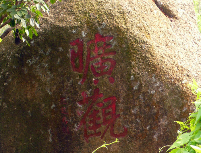 登上崖頂"石溪"巖石右側(cè)一圓石刻著"曠觀"兩字。南眺遠山如黛,玉盤一樣的香洲區(qū)盡收眼底。當(dāng)年名士多聚于此,豪飲放歌賦詩懷古,留下累累筆墨石刻,因年代久遠,現(xiàn)存僅三十余處。石溪摩崖時刻群大多取意于環(huán)境、石貌、如"茂林修竹"、"樵徑"等游人至此,如臨一座書法展覽館,趣味橫生。
