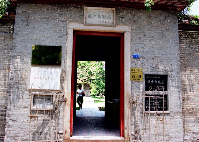 位于江門(mén)市江海區(qū)外海鎮(zhèn)南華里。由陳少白自行設(shè)計(jì)。故居分兩處,隔河相望,以自橋連為一體。橋的一邊是"白園",另一邊是一座"三合院"式的居所。始建于1929年,1931年落成,占地面積兩畝許。自少白逝世后,其家居多旅居外地,樓宇日久失修,漸顯頹敗。1991年春,外海鎮(zhèn)政府撥出巨款?對(duì)"白園"和園內(nèi)的"莎蘿坪"、"粥鍋亭"、"瞻云臺(tái)"等建筑,以及"三合院"和院內(nèi)的"亞字樓"等都一一進(jìn)行了修復(fù),并在故居內(nèi)設(shè)立"陳少白事跡陳列館",陳列大量名人字畫(huà)及歷史文物。使故居還其原貌,煥發(fā)青春。