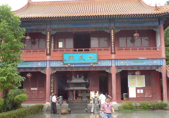 唐宋以降,古岡州即新會,在象山上有一紫云洞,就是道教一直承傳和布教活動的地方,據(jù)《新會縣志》記載,在清代嶺南道教興隆,民間信仰廣泛,在同治元年(1862年)就有道人在紫云洞內(nèi)奉祀?yún)味促e祖師,在當(dāng)?shù)貍髡f呂祖為百姓消災(zāi)造福非常靈驗,因此紫云洞香火鼎盛,美名遠(yuǎn)播。到民國期間,僅有道士梁榮(俗稱字紙榮)在會城紫云洞守祠, 沒有道壇設(shè)置。該廟后來被毀與戰(zhàn)火。上世紀(jì)90年代,信眾倡議重建紫云洞,經(jīng)熱心人士與政府有關(guān)部門計劃重建該廟,后由香港“譚兆慈善基金”捐款三千余萬元,易地在圭峰山國家森林公園重建,并正名為紫云觀。經(jīng)1996年奠基,1998年動工,主體工程歷于2001年6月完成,并于2002年6月26日神象開光并對外開放。