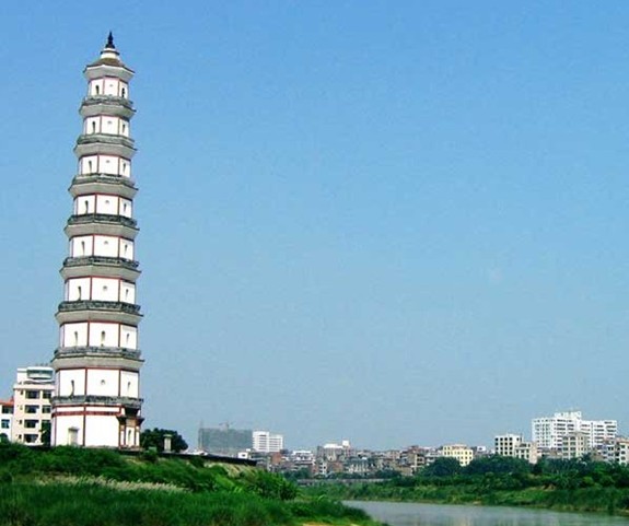 寶光塔位于高州市區(qū)西南部的鑒江河畔上,建于明代萬歷四年( 1576 )。該塔為八角九層樓閣式磚塔,通高 65.8 米,底層邊長 5.72 米。塔身全部用青磚砌筑。塔基為須彌座,束腰部分各面均嵌有花崗巖浮雕圖案 3 幅,每幅浮雕長 1.45 米,高 0.55 米。浮雕內(nèi)容分別有吉祥富貴、雙鳳朝陽、鵬程萬里、魚躍龍門,還有獨(dú)具特色的高州香蕉圖等。兩幅浮雕之間,鑲嵌一塊竹節(jié)形石浮雕相隔。