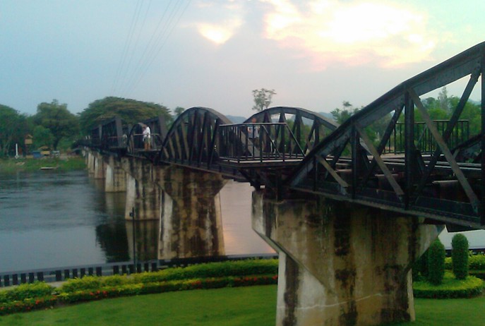 桂河大橋原為木橋,幾經(jīng)飛機(jī)轟炸,早已毀壞,只有在河水很淺時(shí)才能看到殘跡,現(xiàn)在我們看到的是后來修建的鐵橋,它今天還在通車。重建后的桂河大橋,在原來橋的兩側(cè)圓弧鐵架多出了兩段不協(xié)調(diào)的方形鐵架,沒有原先圓弧鐵架的優(yōu)美,很多看過的人覺得不倫不類、不搭調(diào)。桂河大橋大約10分鐘就可以走完,過了橋就是一般的死亡鐵路,一直前行可以通到緬甸。站在桂河大橋的橋頭,看著夕陽下靜靜流淌的美麗桂河,使人難以想象這里發(fā)生過的悲慘故事,只有安放在橋頭的美軍投下未爆炸的炸彈提示著我們當(dāng)年那場(chǎng)慘烈的戰(zhàn)爭(zhēng)。
