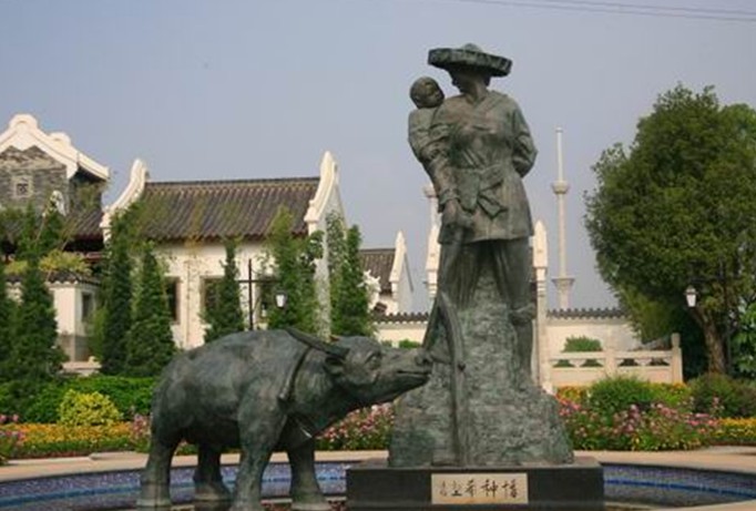 《客家婦女》雕像,高3.9米,整個雕像以青銅灌注而成,以一位頭戴涼帽,身穿大襟衫,背著小孩,乎扶犁耙,赤足在田野耕作的傳統(tǒng)客家婦女形象為主題,它象征著客家女的溫柔、善良、孝順、勤勞、賢惠。