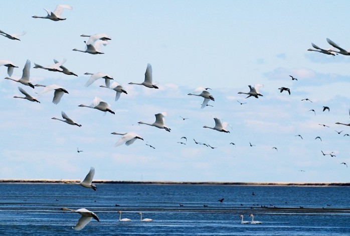 這里湖水清清,水草繁茂,蘆葦蓊郁,一望無際,猶如一條綠色的緞帶,平鋪在呼倫、貝爾兩湖中間。這個(gè)綠色的世界象塊巨大的磁場(chǎng),吸引著眾多鳥類在春天從我國(guó)南方、東南亞飛臨這絕妙的世外桃源安家落戶,生兒育女。