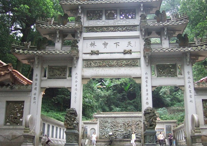 據(jù)明萬歷《曹溪通志》記載:南朝梁武帝天監(jiān)元年,印度高僧菩提達摩東土弘法,歷經(jīng)三年海上航行,首站登陸嶺南。見此地“山水匯合,峰巒奇秀,嘆如西天寶林山也”,遂建議地方官奏請武帝建寺。天監(jiān)三年(公元504年),寺廟建成,梁武帝賜額“寶林寺”。唐儀鳳二年(公元677年)始,中國佛教禪宗創(chuàng)始人六祖惠能大師來寶林寺說法37載,使南宗禪法大播于天下。故南華寺素有南禪祖庭之稱,還與嵩山少林寺并稱為禪宗祖庭,在東南亞、朝鮮、韓國、日本以及歐美等國家和地區(qū)有重要影響。武則天萬歲通天元年(公元696年),武則天賜慧能水晶缽盂、磨衲袈裟等物。唐神龍元年(公元705年),中宗又賜寶缽、磨衲袈裟等物,并將寺名賜改為“中興寺”;神龍三年(公元707年)再改“法泉寺”。宋開寶元年(968),太祖賜額改稱“南華禪寺”,沿稱至今。1983年,南華寺被確定為全國重點寺廟。今南華寺占地總面積約42.5萬平方米,主體建筑群總面積1.2萬平方米。為階梯式中軸線對稱平面布局。寺向為坐北朝南。中軸線上由南至北依次為曹溪門(頭山門)、放生池(上筑五香亭)、寶林門(二山門)、天王殿、大雄寶殿、藏經(jīng)閣、靈照塔、祖殿、方丈室。自天王殿始作封閉,東側依次為鐘樓、客堂、伽藍殿、齋堂等;西側依次為鼓樓、祖師殿、功德堂(亦稱西歸堂)、禪堂、僧伽培訓班等。主體建筑院落外,北側有卓錫泉(俗名九龍泉)、伏虎亭、飛錫橋;西側有無盡庵、海會塔、虛云和尚舍利塔;東側有中山亭。