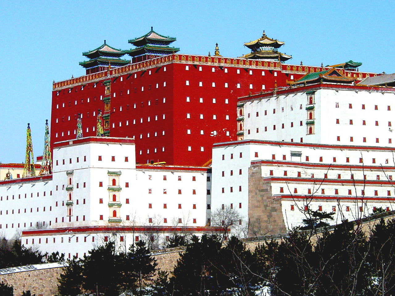 普陀宗乘之廟是仿西藏拉薩布達拉宮修建的,“普陀宗乘”是藏語“布達拉”的漢譯。廟依山建造,坐北朝南,山門內(nèi)是碑閣,北是五塔門,版權(quán)所有聊城聊之旅國際旅行社有限公司,轉(zhuǎn)載必究!高十余米,有拱門三個,上建紅、黃、黑、白、綠五座喇嘛塔。門北是琉璃牌坊。牌坊北地形漸高,各式白臺、塔臺建筑因地形而散置,高低有別,變化多端。最后為雄偉高大的主體建筑大紅臺。大紅臺的正面,下面是高達十八米的大白臺,其上聳立著高達二十五米的大紅臺。紅臺內(nèi)四周為三層群樓,中央是重檐攢尖鎏金銅瓦項的“萬法歸一”殿。 普陀宗乘之廟布局分三個部分:前部包括山門、碑亭、五塔門;中部包括琉璃牌坊、白臺、僧房等;后部是主體建筑大紅臺及周圍其他建筑,大小共60余處,被包圍在雉堞銜連、依著山勢起伏而環(huán)寺一周的高大圍墻之內(nèi)。