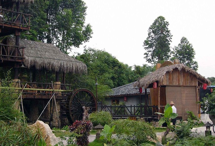 極目莊園方圓幾百畝,百畝水面,風(fēng)平如鏡,或銀波閃爍,或迂回於幽篁之中,或穿行於絲柳之側(cè),亭閣倒影似蜃樓海市,葉葉扁舟如散花點(diǎn)點(diǎn),裝一船歡歌,載一家笑語(yǔ),天倫之樂不亦悅乎!籍田園風(fēng)光之茅屋草寮星羅棋布於全園,皆取法乎自然。或傍水,或依山,或掩蔭於翠竹之下,或深藏於幽徑之中,置身其中,恍若隔世桃源,疑是玉宇瓊臺(tái)。