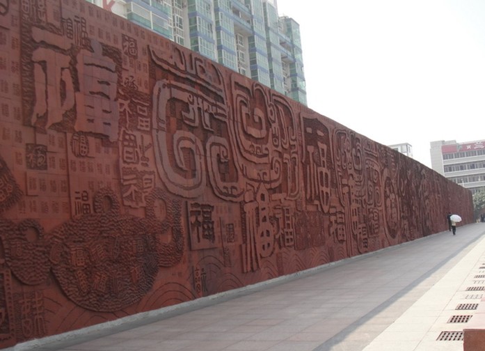 在廣場(chǎng)南側(cè)建有紫砂陶浮雕萬(wàn)福壁,雙面長(zhǎng)260米、高6米、作品厚度10-16厘米,紫砂作坯陰干、雕刻,經(jīng)1160攝氏度高溫?zé)贫伞9菜鸭酥袊?guó)歷代不同寫法的“福”字1萬(wàn)余個(gè),該作品經(jīng)中國(guó)美術(shù)學(xué)會(huì)雕塑專業(yè)委員會(huì)鑒定后于2000年4月收入大世界基尼斯之最。福字作為中國(guó)民間的傳統(tǒng)文化的元素,版權(quán)所有山東聊城聊之旅國(guó)際旅行社有限公司,轉(zhuǎn)載必究!有著數(shù)千年文明歷史,是人們對(duì)美好愿望無(wú)永遠(yuǎn)追求和孜孜祈愿,《萬(wàn)福壁》將其與千百年來(lái)民眾賴以棲身的中國(guó)式長(zhǎng)墻結(jié)合在一起,體現(xiàn)了傳統(tǒng)藝術(shù)與中國(guó)民俗的高度統(tǒng)一。自萬(wàn)福壁建成后引來(lái)眾多游人前往觸摸壁上各種寫法的福字以求沾染福氣。 萬(wàn)福廣場(chǎng)始建于1978年,1979年收集完成,1980年完成