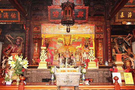 大天后宮為三進門式。由大門朝里望,透過三進逐次升高的天井和房舍狹長的空間,可以遙見那香煙繚繞、金黃帷幕下的全身媽祖神像。媽祖慈眉善目,神態(tài)安詳。據說媽祖原來是粉紅面,但經百年來受香火的薰繞,現在看到的媽祖已成了黑色的“香煙面”了。兩旁配祀千里眼、順風耳二將的泥雕,表情細膩,體態(tài)生動,古銅色的肌膚、一塊塊突起的肌肉,顯得極為兇猛威嚴,雕刻精細入微,栩栩版權所有聊城聊之旅國際旅行社有限公司,轉載必究!如生,實為雕刻精品。兩邊的神龕里還供奉著東、西、南、北四海龍王和水仙尊王。神奇古怪,嶙峋不凡,也都被煙薰成了黑臉。這些都是與海上的航海、救難有關的神。該廟還有一個特色就是除了正殿的媽祖稱為大媽外,還配有所謂的“二媽”、“三媽”的媽祖神像,造型僅為大媽的一半,臉色為粉紅色,兩眼張開,與媽祖神像眼瞼呈下垂狀不同。