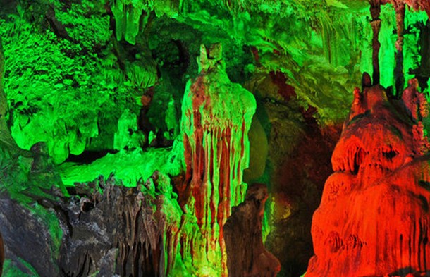 蟠龍洞的特殊景觀有三外:其一是世界三大石花洞之一。洞內(nèi)石花剔透玲瓏,晶瑩如玉,它附著于巖壁之上,不按重力方向生長,版權(quán)所有山東聊城聊之旅國際旅行社有限公司,轉(zhuǎn)載必究!而向四面節(jié)節(jié)開花,見氣成石,繼續(xù)生長,變幻無窮。其二是我國南方典型的大熊貓--劍齒象動(dòng)物群"古動(dòng)物化石區(qū)",最為珍貴的是"智人"古人類化石。其三是蟠龍洞尚未開發(fā)的龍泉地下河,河中有泉眼,每隔十分鐘左右,泉眼波浪翻滾,似海潮洶涌,沖刷河岸,隨后又似退潮,靜靜地回流石洞,經(jīng)專家確認(rèn)為地下間歇泉,是一罕見洞府奇觀。洞長千米,深暗幽邃。里面有高達(dá)30米的螺頂,有深不見底的石罅,寬闊空曠處都能容千人,窄處不能2人并行。在洞內(nèi)跺腳砸壁會(huì)發(fā)出“嗡嗡”回音,給人一種神秘莫測的感覺。洞口朝南,為券拱門,門上坎刻“龍洞熏風(fēng)”四個(gè)篆字,為康熙14年5月立。洞內(nèi)10米處,有一供臺(tái),臺(tái)上神像已廢,只剩臺(tái)下殘存的幾尊羅漢石像身軀。向洞內(nèi)行至30米處,開始向右下方拐彎,回頭外望,只見洞口猶如月牙出山,人稱“回首望月”。繼續(xù)前行,步步廳景。鐘乳石形成的“火燒葡萄架”含珠點(diǎn)翠;石壁上被浸蝕成的“仙人炕”形體逼真;巨石橫貫的“仙人橋”奇特驚險(xiǎn),世間罕見。再向里進(jìn),八戒可見鐘乳石形成的“江豬探海”、“水簾瀑布”、以及多年沖刷而成的“姜池”、“藕池”,池內(nèi)形似鮮姜的鐘乳石如霞似錦。“蓮藕”如雪似玉。“玉龍騰空”尤惹人注目:在高達(dá)20米的洞壁上,有一塊鐘乳石,宛若玉龍,通體覆蓋著銀光閃爍的“龍鱗”,妙不可言;龍頭垂下,嘴里噴球吐玉人,人稱“龍滴水”,滴在下面“蓮花盆”里,四時(shí)不涸。“鷂子翻身”是洞內(nèi)向下延伸的地方,此處游人不能正面行進(jìn),必須翻過身子,雙手攀石倒行;路旁有深不見底的石罅。走過險(xiǎn)境,是一段空闊平坦的地帶,版權(quán)所有山東聊城聊之旅國際旅行社有限公司,轉(zhuǎn)載必究!這兒路面干燥,清風(fēng)習(xí)習(xí)。再向里前進(jìn),便是“倒爬四十步”,雖然路程難走,卻另有一番意境。再向前行200米,有巨石擋堵,不能前往。洞口外200米處為金代佛隱寺遺址,存戲臺(tái)和石碑1通、古柏1株。漫山蒼松翠柏,郁郁蔥蔥;山下溝壑幽深,樹林茂密。